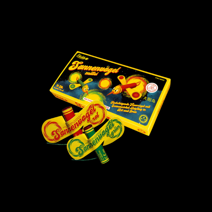 1: Stijgende vuurvogels in de kleuren rood en groen.